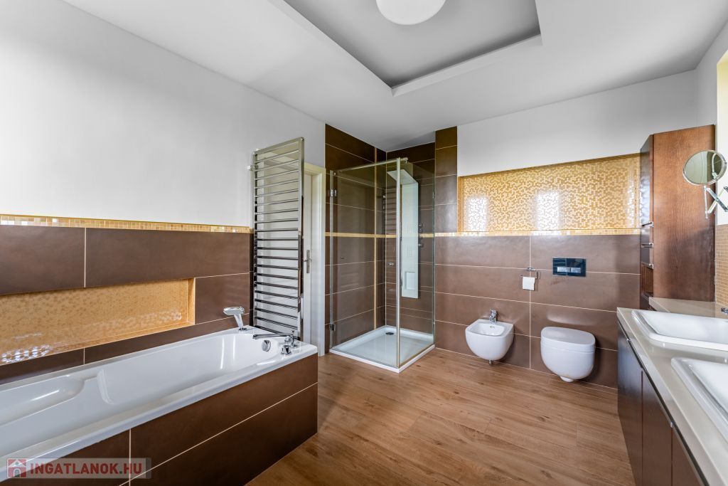 Az emeleti szinten több hálószoba, gardróbok, tágas fürdők és részleges panorámás terasz teszik teljessé az életteret.