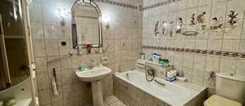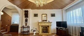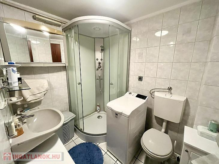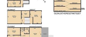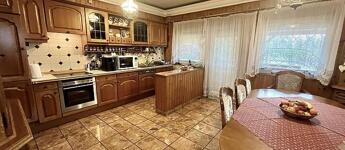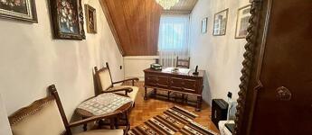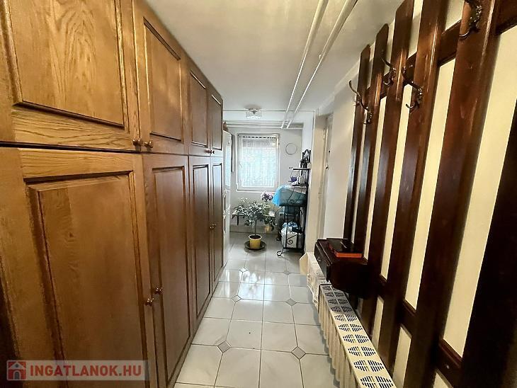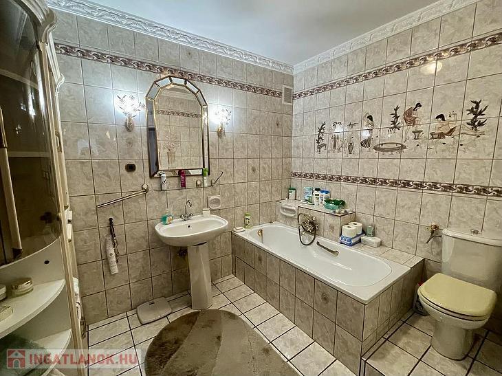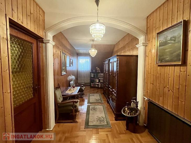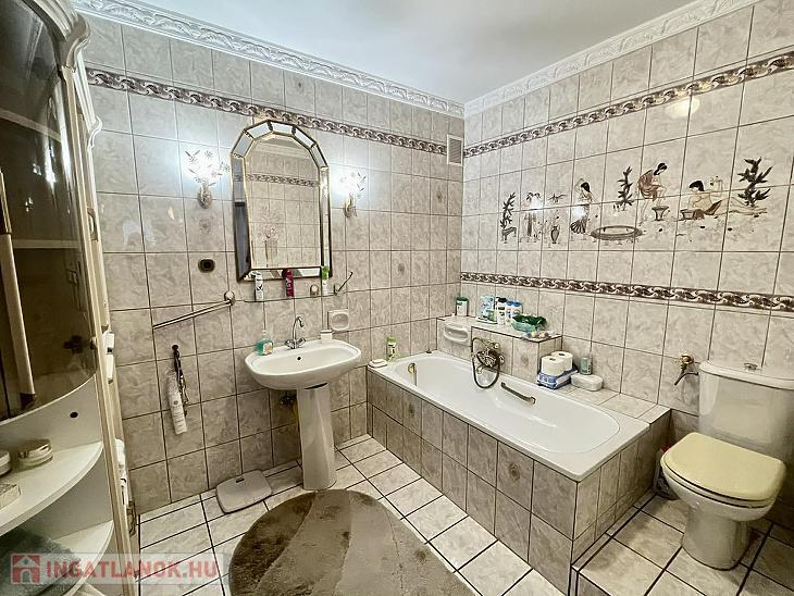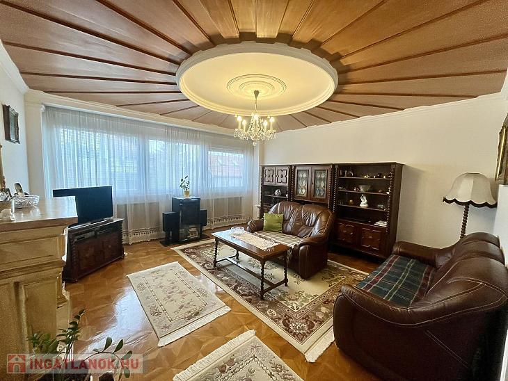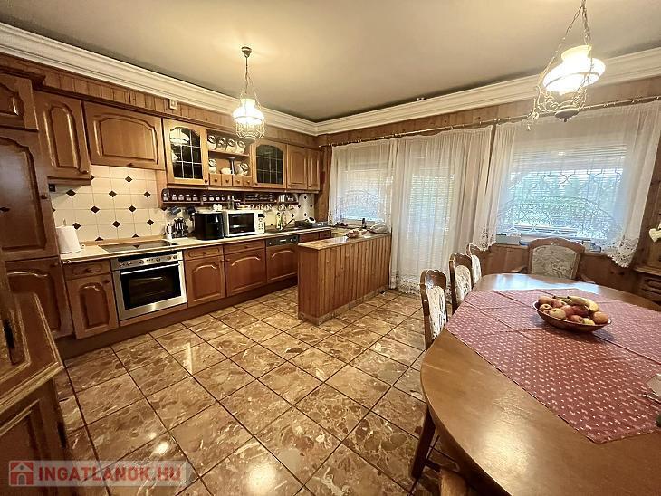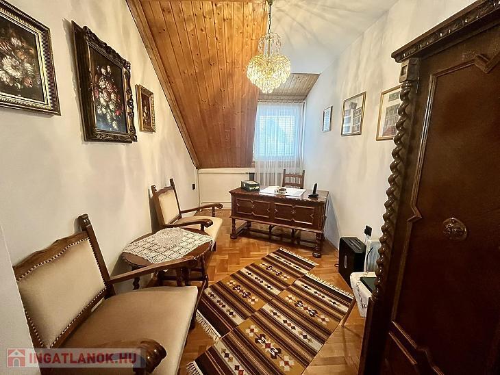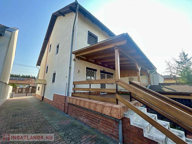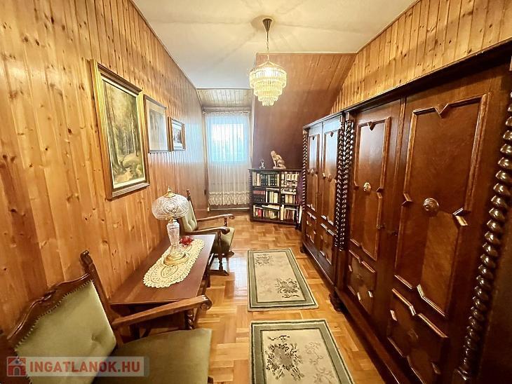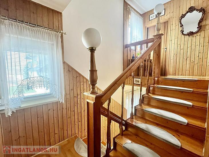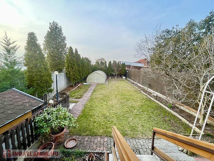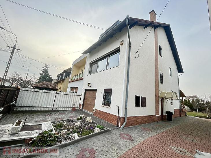 A nettó 131 m2 tégla ház 1991-ben épült szinteltolással. Előkert és tágas, rendezett kert tartozik hozzá. A földszinten található egy ablakos gardrób, tárolóhelyiség, hidromasszázs zuhanykabinos fürdő és fűtött garázs elektromos kapuval. Fél emelettel feljebb nyílik a nagy, étkezős konyha, amelyből a 16 m2-es fedett teraszon át a gondozott hátsó kertbe léphetünk ki. A félemeleten tágas, napfényes nappali helyezkedik el látványkandallóval, faberakásos mennyezettel, valamint a Valentino burkolatú, kádas fürdőszoba. Szintén fél emelettel feljebb található egy kertre néző hálószoba, amit a következő szinten két külön bejáratú hálószoba követ. Igény esetén a padlástér tovább bővíthető. Az ingatlan minőségi anyagokból épült, időtálló, igényes kivitelezéssel. Műanyag hőszigetelt ablakokra cserélték a nyílászárókat, a lépcsőházban 4 ablak fa maradt. Pala fedi a tetőt. A kertben fúrt kútról működő automata öntözőrendszert építettek ki és egy 6X3 méteres, lefedhető medencét, amit hideg-meleg vízzel lehet feltölteni. Kandeláberes kerti világítás és a tuja- és rózsasorral szegélyezett pázsit emeli az udvar hangulatát. A garázs mellett 3 autó számára zárt parkolási lehetőség is biztosított a térkővel burkolt udvaron. Riasztórendszer és kamerás kaputelefon van beépítve.