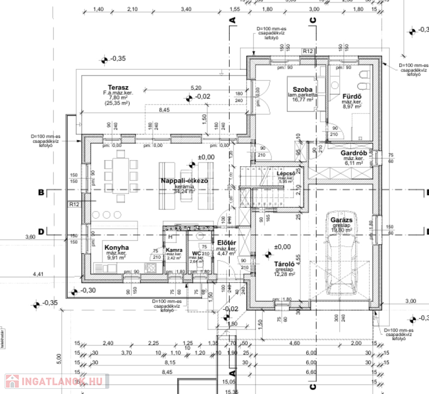 Földszint – 131,36 m² (lakótér + garázs + tároló + fedett terasz):