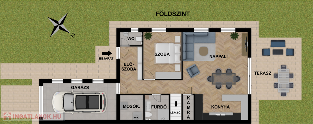 A 2 szintes ingatlan földszintjén tágas amerikai konyhás nappali teraszkapcsolattal, hálószoba, fürdő, külön mosdó, kamra, mosókonyha és garázs került kialakításra.