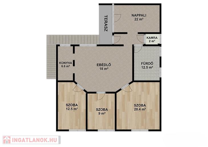 4 szoba, amerikai konyhás nappali, fürdőszoba + mellékhelyiség, kamra, erkély.