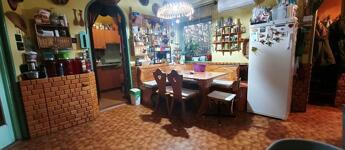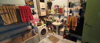 A szobákban, a nappaliban, az étkezőben és a kamrában linóleum, valamint padlószőnyeg a konyhában és a fürdőszobában pedig kő burkolatok vannak.