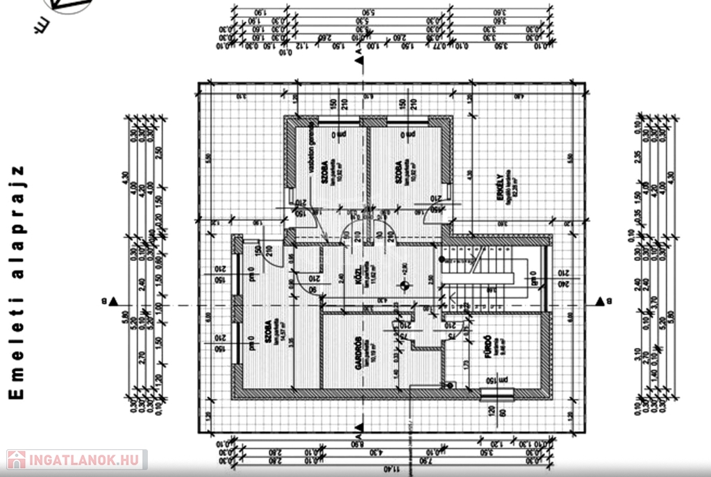 AZ EMELETI SZINTET kényelmes lépcsőkön érjük el, ahol tágas előtér fogad, melyből külön nyílnak a napfényes hálószobák(10,90 m2, 10,90 m2, 14,60 m2) és egy gardrób szoba ami(10,2 m2).
