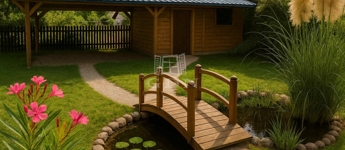 A ház körül közel 300 négyzetméteren kertészkedhetünk, ahol egy dizájnos kis kerti tó is fokozza a hangulatot. Az udvarban helyet kapott még egy 16 négyzetméteres garázs meg egy kút is. Kívülről a házhoz két terasz (2 nm+ 7 nm) kapcsolódik, ahonnan a Dunára nyílik gyönyörű panorámás kilátás. Az udvar, méretéből adódóan medence építéséré is alkalmas.
