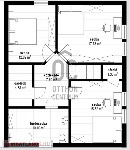 Emelet helyiségei: három hálószoba, gardrób, fürdőszoba-wc.