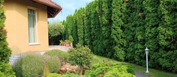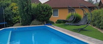 A medence, a szaletli és a gondosan tervezett kert valódi pihenőoázist nyújt, míg a napelemrendszer fenntartható és energiatakarékos működést garantál.