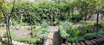 A sok gondoskodással művelt kert fúrt kútról van öntözve. Rengeteg dísznövény és gyümölcsfa található. Magas ágyásokban konyhakerti növények zöldellnek.