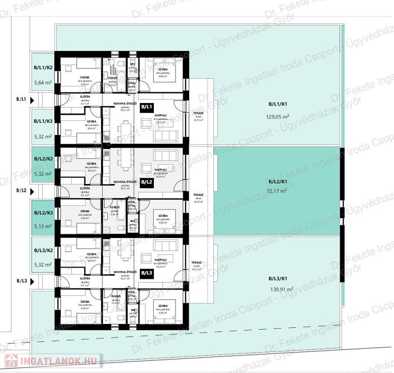 Minden lakás mérete megegyezik, csak a kert mérete változó.(Lásd alaprajzok)