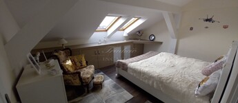 Az emeleti szint a hátsó terasz irányából is megközelíthető, itt egy étkezős konyha (még nem használt, vadonatúj konyha, felső kategóriás gépekkel) , egy fürdőszoba, valamint 2 szoba található, amelyből az egyik szoba nappaliként a másik pedig egy saját erkéllyel rendelkező hálószobaként funkcionál. A tetőtérben további két kellemes méretű hálószoba, a háztartási helyiség és a harmadik fürdőszoba található.