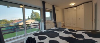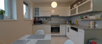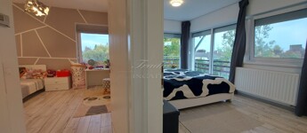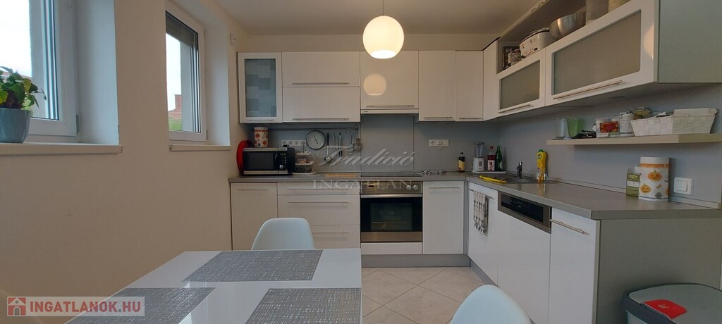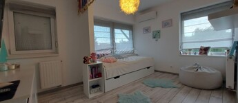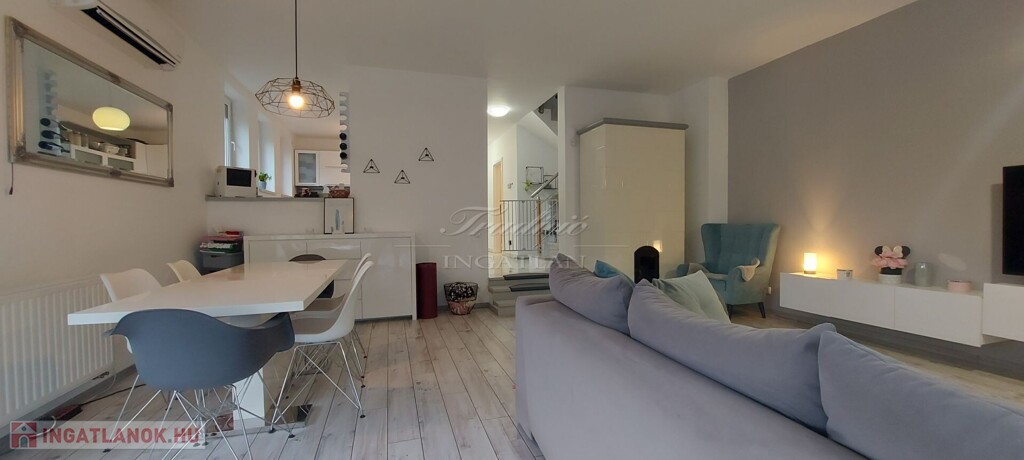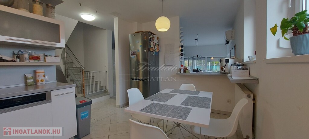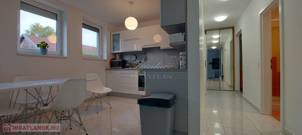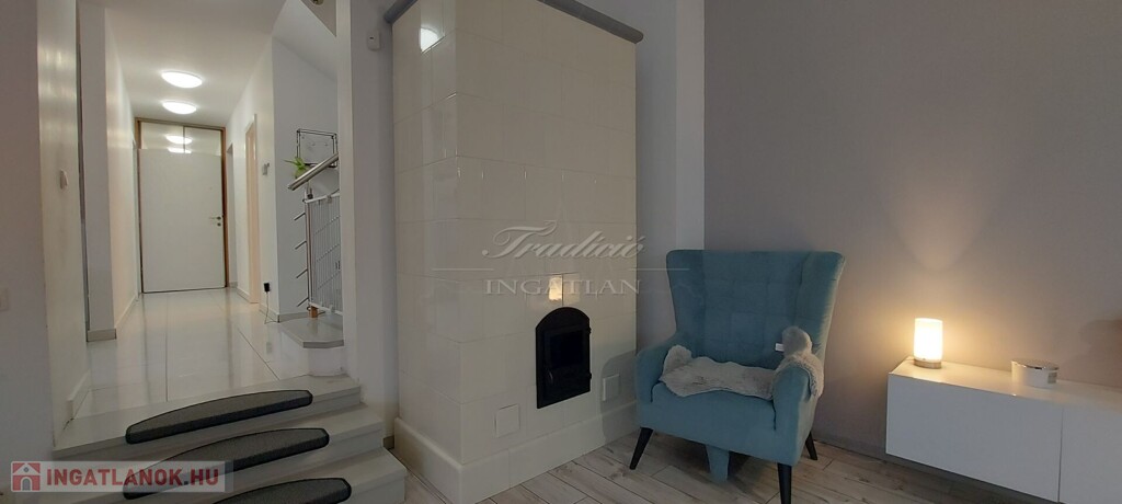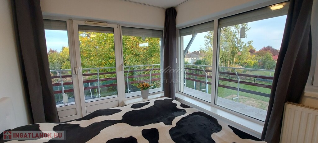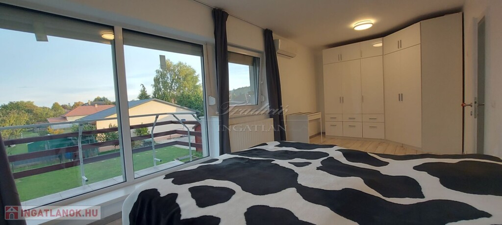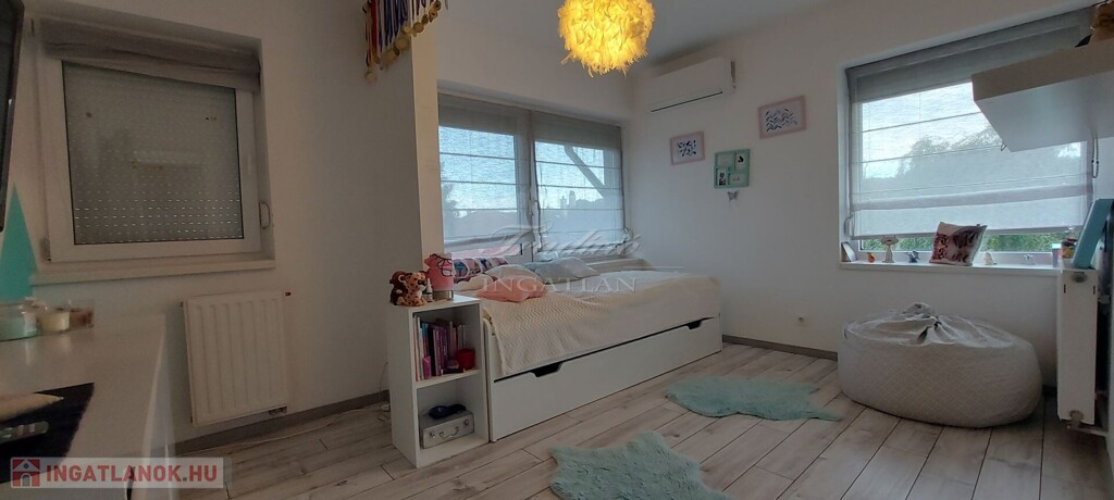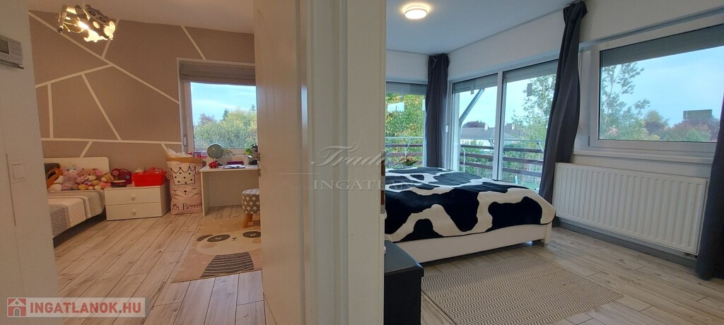 A tágas, nagy üvegfelülettel rendelkező napfényes nappali közvetlenül kapcsolódik az étkezőhöz és a vele egylégterű modern-gépesített konyhához, így a családi együttlétek természetes központja a tér. Az elrendezés átgondolt: négy különnyíló hálószoba, háztartási helyiség, gardrób, valamint két fürdőszoba és külön mellékhelyiség is szolgálja a kényelmet. Az emelet teljes értékű, nem tetőtér-jellegű, így minden szoba szellős, világos és valódi élettér. A két tágas erkélyről páratlan kilátás nyílik a győrújbaráti dombokra.