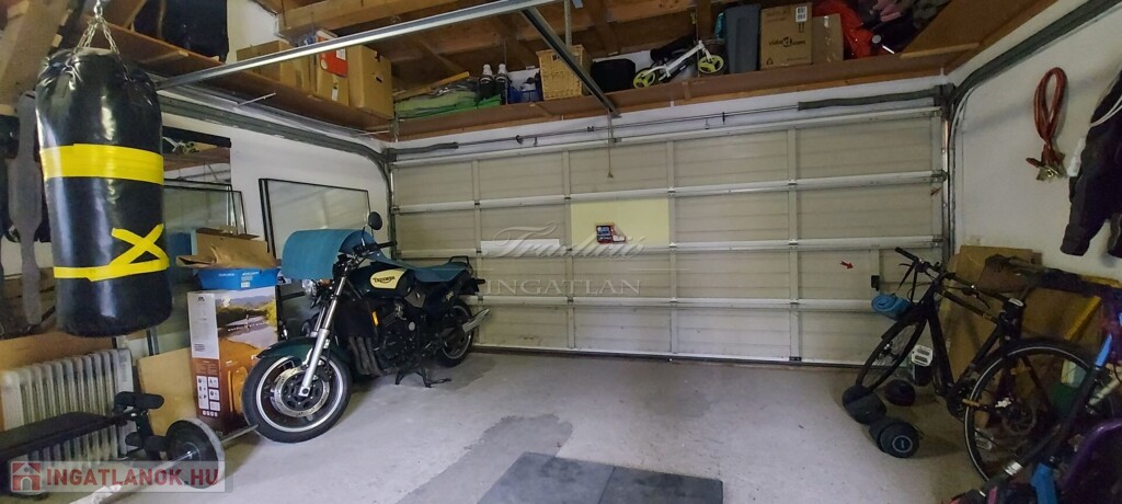 A 32 m²-es garázs szekcionált kapuval és magas belmagassággal rendelkezik, ezáltal tárolásra is jól használható. A garázson kívül két térkövezett parkoló és egy fedett gépkocsibeálló ill. járda is készült.