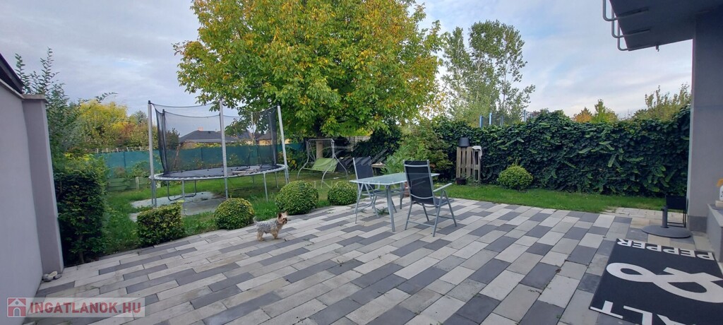 A nappalihoz 30 m²-es intim terasz kapcsolódik, a bőséges-füvesített előkertben játszóteret is felállítottak a kisgyermekeknek. A 75 méter mély fúrt kút a növényzet vízellátását biztosítja.