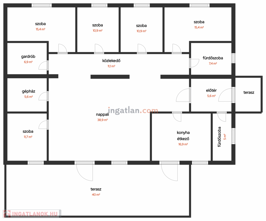 Gyula belvárosában, mégis csendes, átmenő fogalomtól mentes utcában eladóvá vált egy 174 nm alapterületű, harmonikus kialakítású családi ház. Az ingatlan 2001-ben épült tégla falazattal, 5 cm-es külső hőszigeteléssel. A házban egy tágas nappali, 5 hálószoba, 2 fürdőszoba, egy előszoba, egy gardrób egy étkezős konyha és egy háztartási helyiség is helyet kapott. Az ingatlant egyedi kialakításának és nagy méretű ablakainak köszönhetően tágas helyiségek és mindig napfényes terek jellemzik. A ház fűtéséről gázkazánról működtetett radiátorok gondoskodnak, emellett a kémény kialakításának köszönhetően csempekályha vagy más alternatív fűtés kiépítésére is lehetőség van. A ház 2001-ben teljes felújításon esett át, melynek keretében megtörtént az aljzat szigetelése, a víz- és elektromos hálózat (3x16A) korszerűsítése, valamint a tető és a külső falazat szigetelése is. Emellett a tetőszerkezet új födémet kapott, melynek köszönhetően lehetőség van a tetőtérben további lakrész, vagy akár külső megközelítésű apartmanok kialakítására is.A nyári hónapokban a közel 60 cm-es vastagságú falak mellett 2 klímaberendezés is gondoskodik a kellemes hőmérsékletről. A nappaliból és a konyhából is közvetlenül megközelíthető tágas, 40 nm alapterületű fedett terasz egyedi kialakításának köszönhetően tökéletes helyszíne lehet nagyobb családi vagy baráti összejöveteleknek. A telek alapterülete 684 nm, melyben egy duplagarázs is helyet kapott és számos gyönyörű fa nyújt árnyékot a nyári melegben. Kitűnő elhelyezkedésének és elrendezésének köszönhetően tökéletes választás nagycsaládosoknak, több generációs családi háznak, de akár befektetőknek vendégház kialakítására is. Az ingatlan a belvárosban található, a Világórától és a Kossuth tértől mindössze 200 méterre, de a Várfürdő és az Almásy-kastély is néhány perces sétával elérhető. A közelben van iskola, óvoda, számos élelmiszerbolt, gyógyszertár, illetve a helyi autóbusz állomás is.