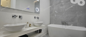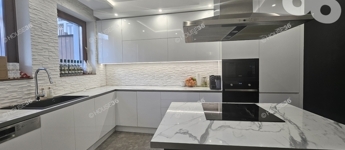 -magasfényű konyhabútor gépesítve (Whirlpool, Samsung, Bosch gépekkel), beép. mosogató, mosógéppel, beép. mikro, hűtő