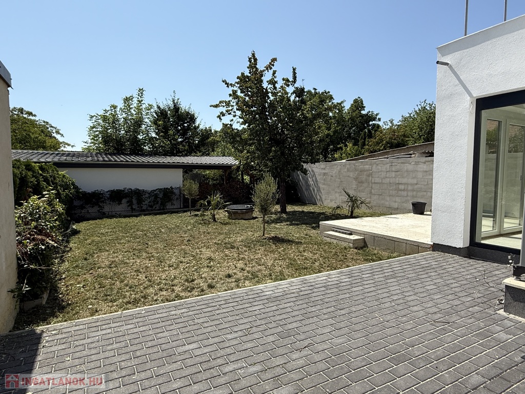 • A kertben a füvesítést elkészítették, ahol egy kút is található. A hátsó ereszcsatornák ide be lettek kötve. A hátsó terasz elkészült, mely 15 m2, ez tovább gondolható akár egy bió pergolával. A belső falat alakítottak ki, melyet a leendő tulajdonos tovább gondolhat igénye szerint.