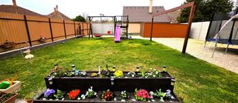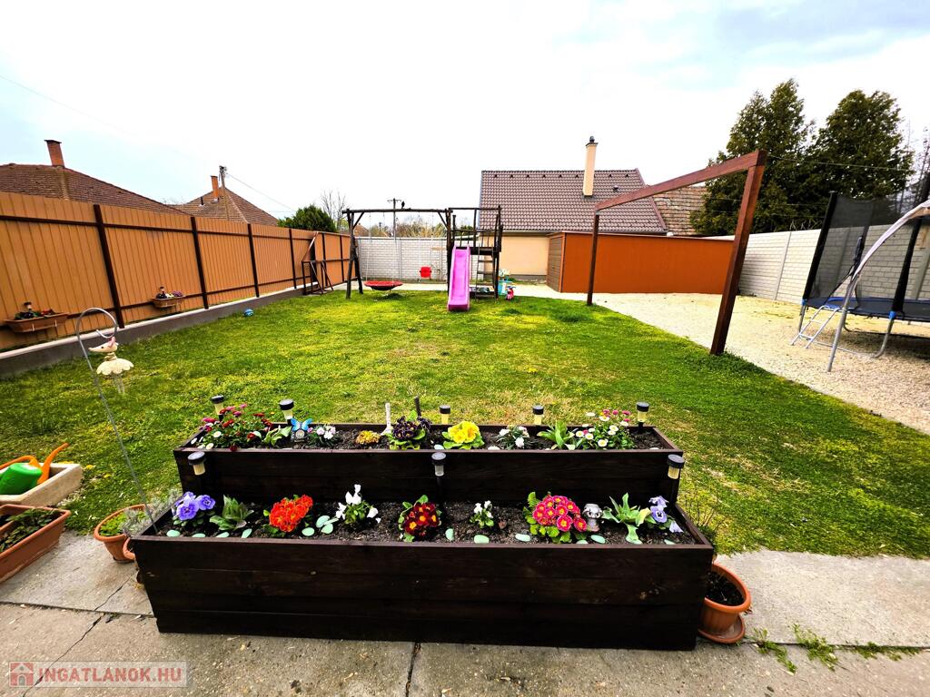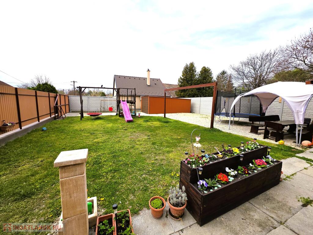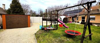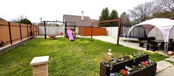 A biztonságról távfelügyeletes riasztó- és kamerarendszer gondoskodik. Az udvar gondozott: betonos, zúzottköves és füves felületek, öntözés fúrt kúttal és kerticsappal.