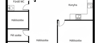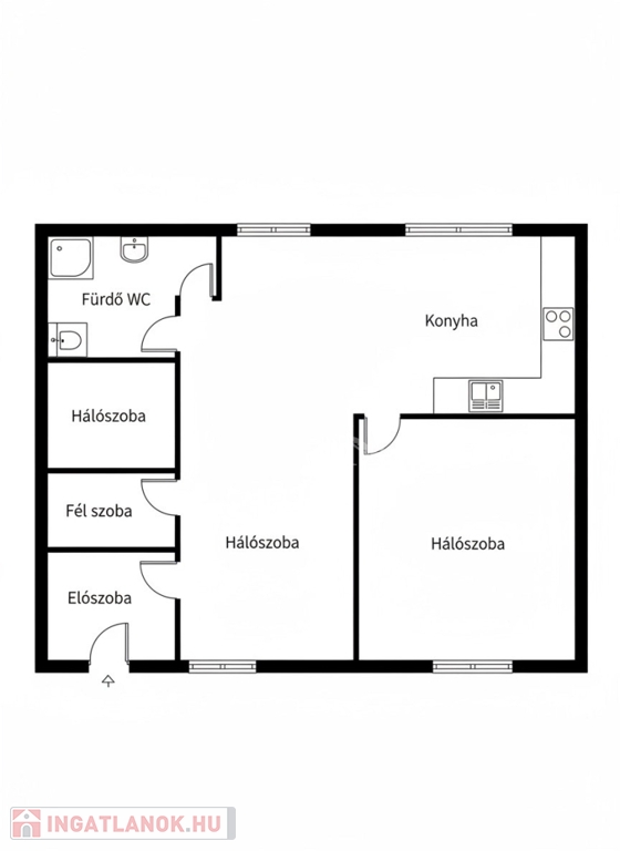 4 szoba (nappali + 2 félszoba + 2 szoba), világos, áttekinthető elosztás, ideális a családi élethez.