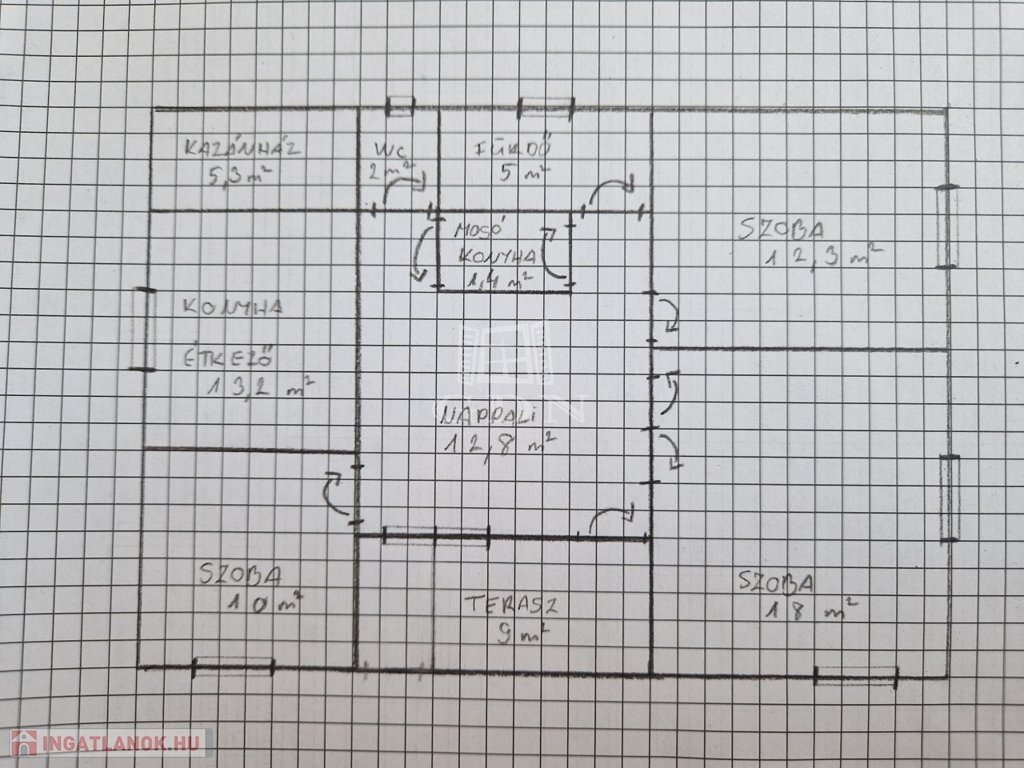 - 82 m2-en ad helyet egy előtérnek, 3 szobának, egy konyhának, egy mosókonyhának, egy fürdőkáddal felszerelt fürdőnek, egy külön helyiségben található toalettnek, valamint egy kazánháznak.