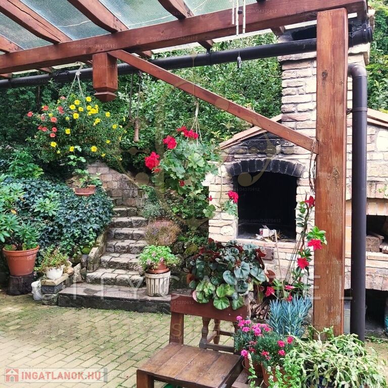 A 742 nm-es kert lejtős, de jól kihasználható – van benne sík terület is, ami ideális lehet kerti partikhoz, játszórész kialakításához vagy akár konyhakerthez. A grillezéshez kialakított teraszról csodás panoráma nyílik a környező dombokra.