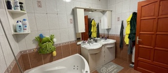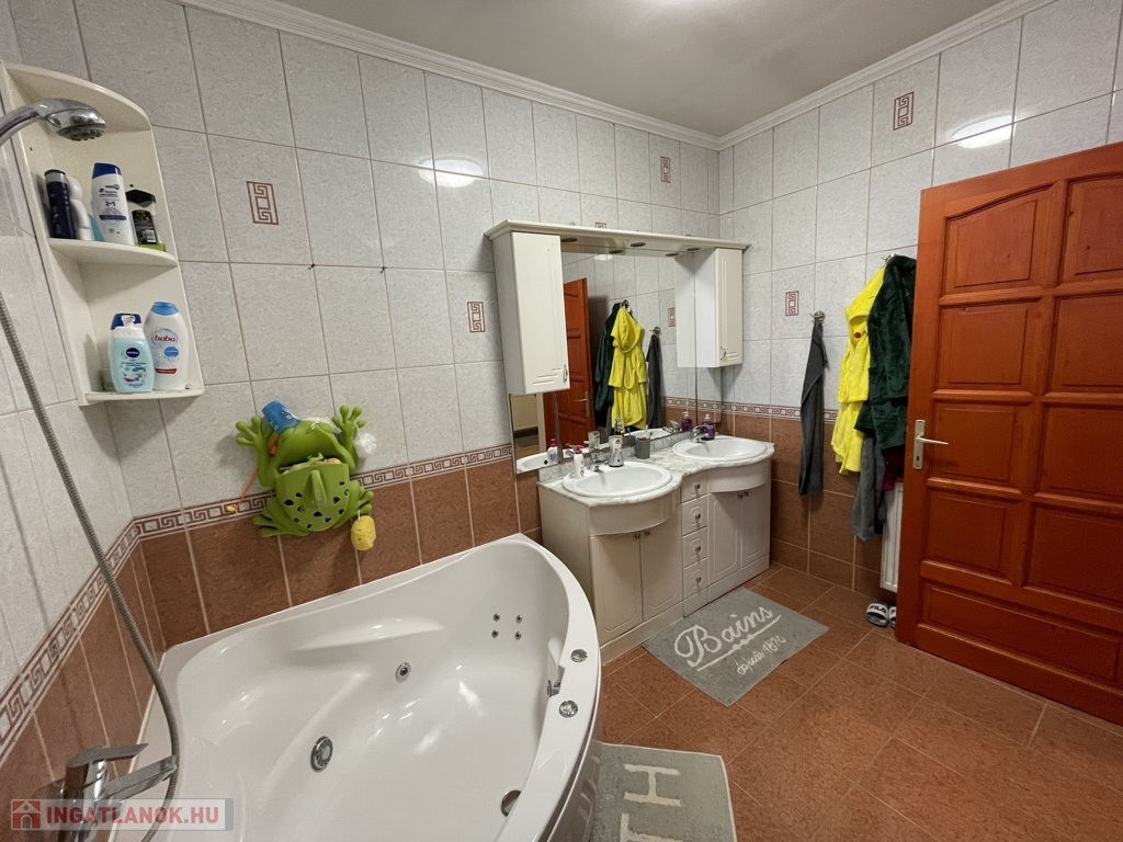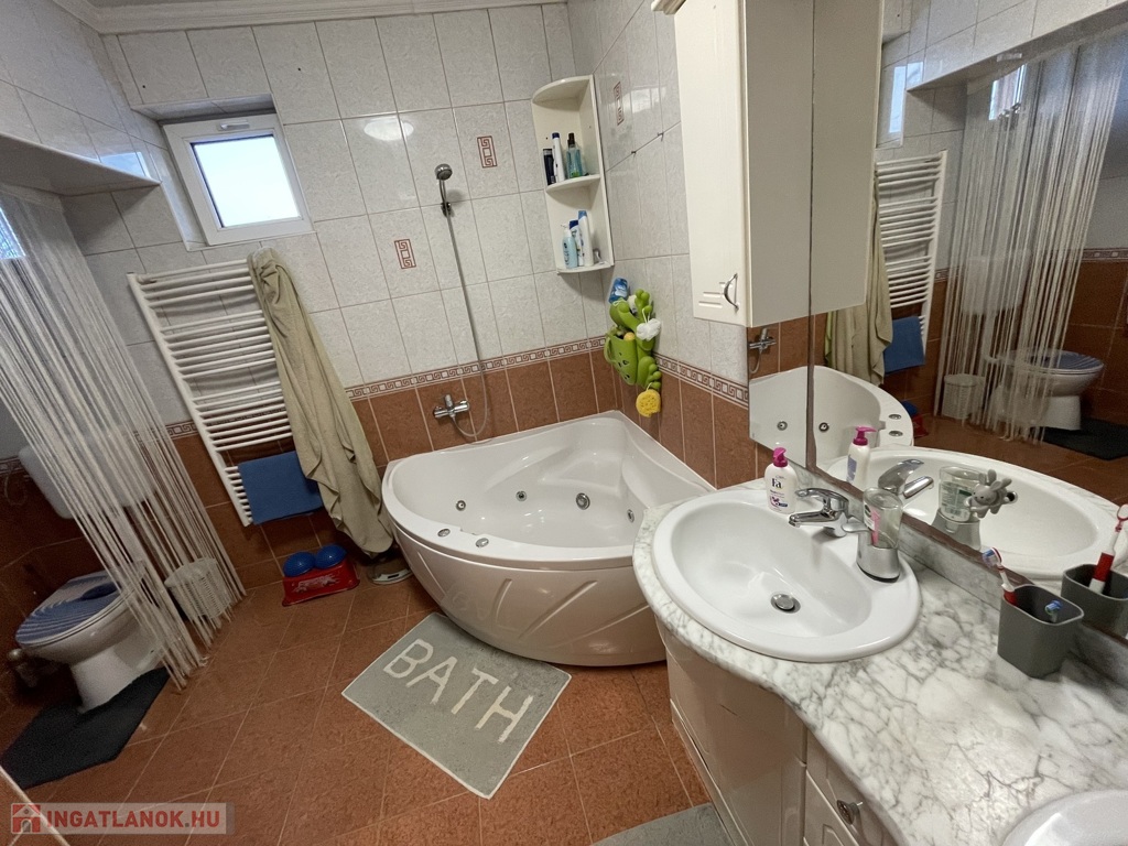 A ház műanyag nyílászárókkal, redőnnyel és szúnyoghálóval, továbbá 3 db klímával és riasztórendszerrel felszerelt. Fűtése gáz kondenzációs kazánnal, alternatív lehetőségként kandallóval megoldott. Az 1014 m²-es, gondozott udvar részben térkövezett, részben parkosított, díszfákkal beültetett, ahol külön filagória, külön fedett autóbeálló, játszótér és automata öntözőrendszer is helyet kapott. Az ingatlan elektromos kapuval zárt.