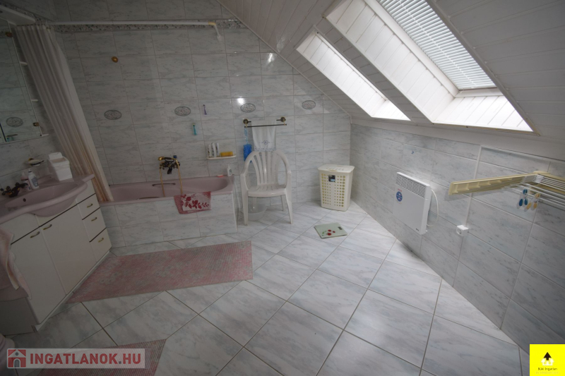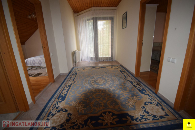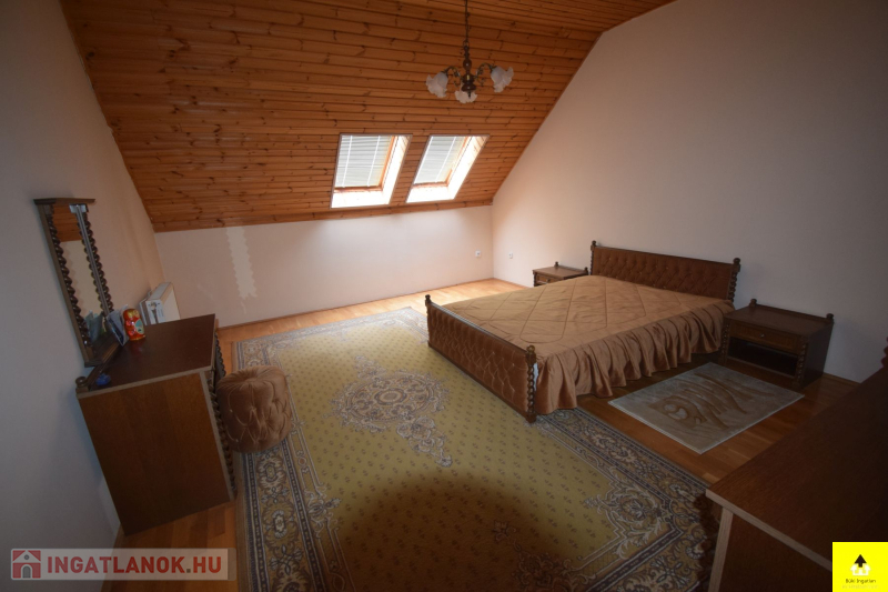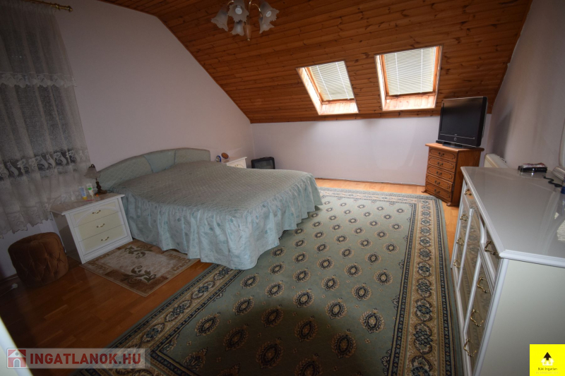 A felső szinten 3 nagy méretű hálószoba, egy tágas közlekedő és egy fürdőszoba kapott helyet.