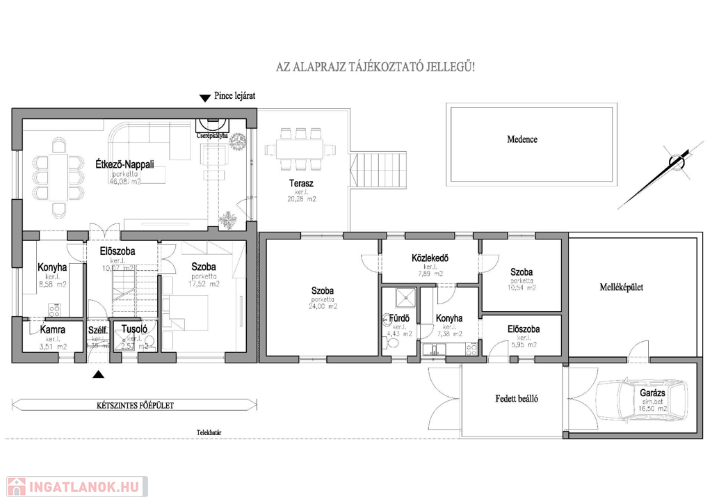 - Földszintes ház: ~60,00 m2, 2 db szoba, konyha, fürdő, közlekedő, előszoba