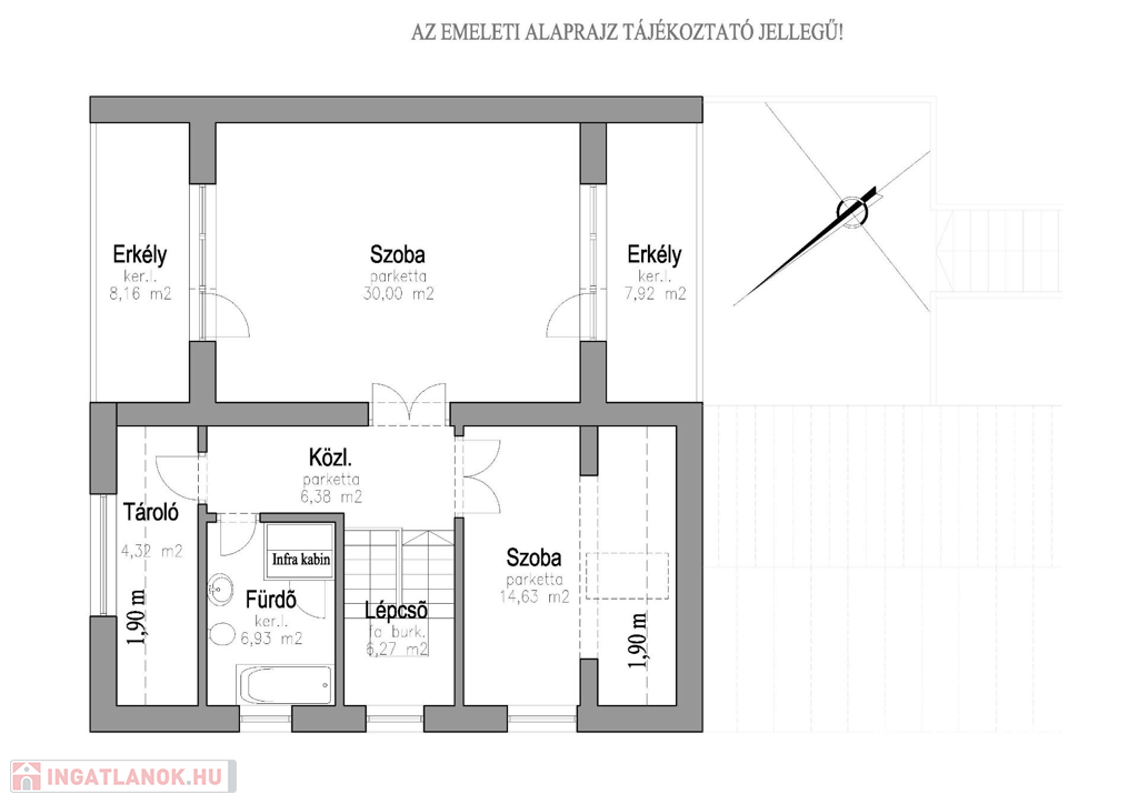 - Emelet: ~68,00 m2, Közlekedő, Fürdőszoba, Tároló,