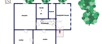 Helyiségek: 2 szoba, konyha, fürdőszoba és beépített terasz.