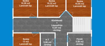 A ház 1 db óriási amerikai konyhás nappalival, 5 db hálószobával, 2 db fürdőszobával, közlekedővel, terasszal rendelkezik. Az ingatlan elhelyezkedésre, kialakítása miatt, maximálisan kiemeli ezt az ingatlant az átlagos lakások sorából és egyedülálló választássá teszi azt. További előny. hogy ház hőszivattyús helyiségenkénti Fan coilos hűtő - fűtő rendszerrel lesz felszerelve.