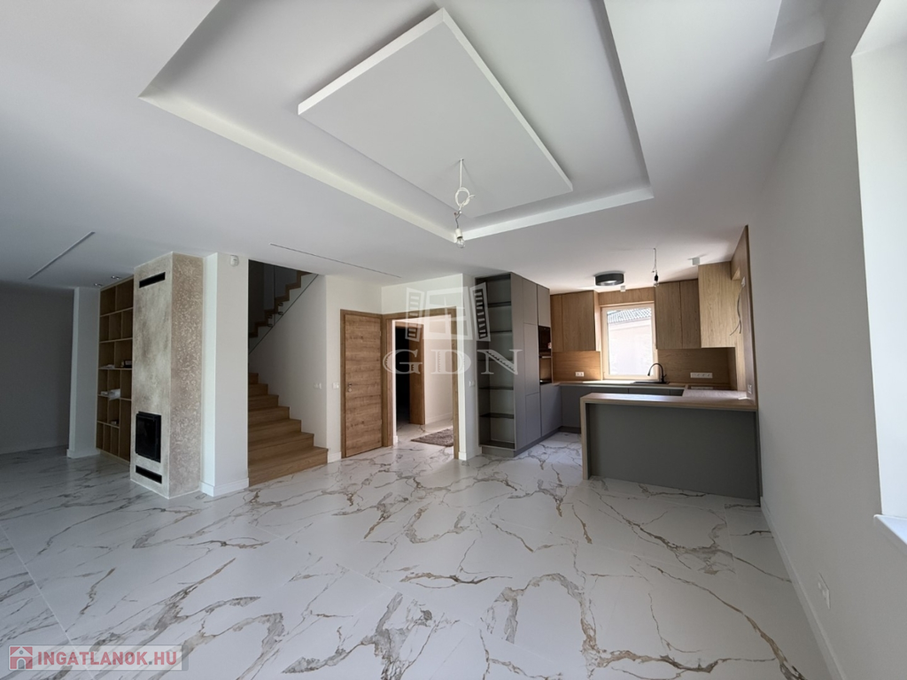 A ház kulcsrakész állapotban kerül átadásra, ennek része a teljesen gépesített, modern konyhabútor, kandalló, nappali bútorzat (TV szekrény, könyvespolc), valamint a háztartási helyiség komplett berendezése.