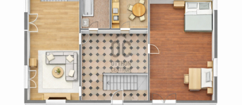• 70 m² földszint: nappali + 1 szoba, összkomfort, garázzsal