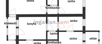 Közlekedőből nyílik egy nagy étkezős konyha, kamra, 3 külön bejáratú szoba, fürdőszoba.