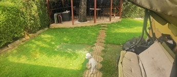 A kert 274 m2 területű, két gépkocsinak van kialakítva beálló, melyhez a kapu motorosan nyitható.