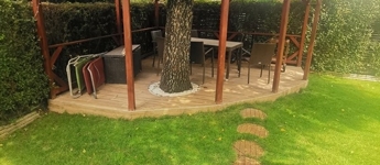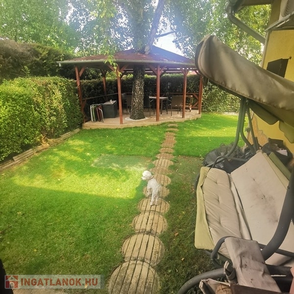 A kerítés mellett körben magas sövény védi a privát szférát, a kert barátságos hangulatáról hátsó terasz, szélvédett bográcsozó és szalonnasütő sarok, tágas, hangulatos szaletli, gondozott fű és egy vadregényes kerti tó gondoskodik. A zöld terület vízellátását fúrt kútról működő távolról is irányítható 4 körös automata öntőrendszer biztosítja az öntözési időszakban.