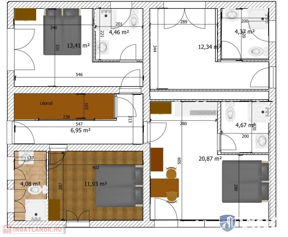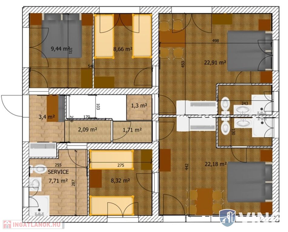 Belső lakrész helységei: 9 szoba, 7 fürdőszoba, 3 konyha közlekedő, lépcsőház.